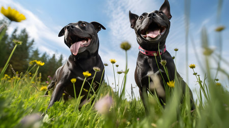 An AI generated illustration of Two black dogs, with mouths agape, sitting in a lush field of tall grass