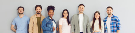 Multicultural group of young people in casual clothes standing in a row on a gray background. Portrait of a successful happy team. Concept human resources, portrait indoor, people meeting