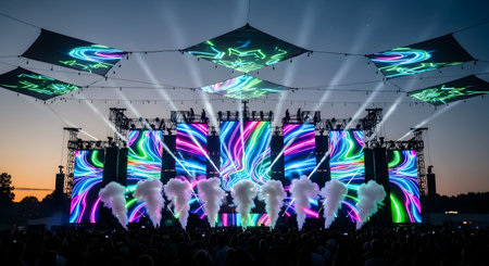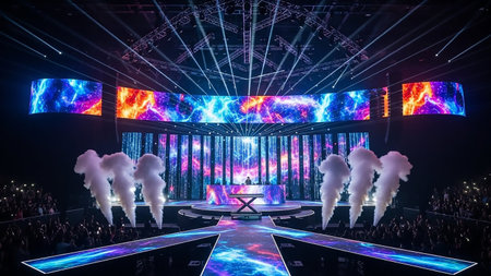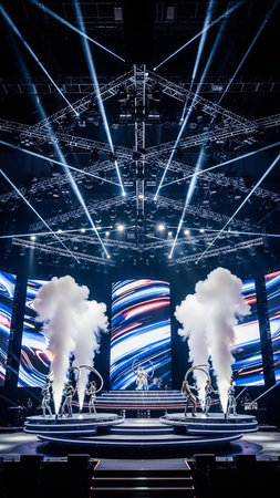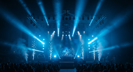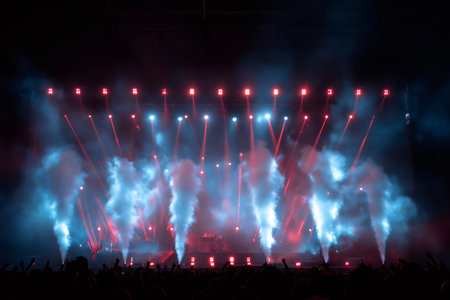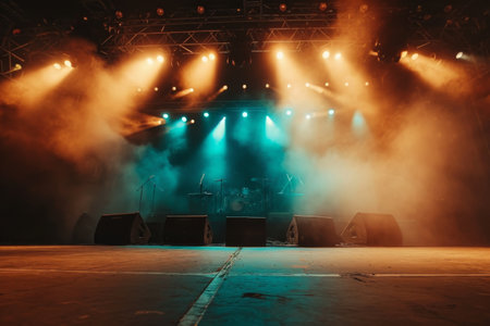 Vibrant concert stage with dramatic smoke and dynamic lighting effects