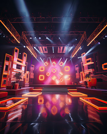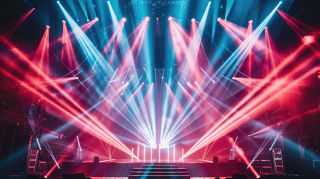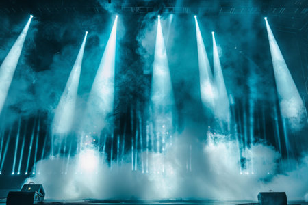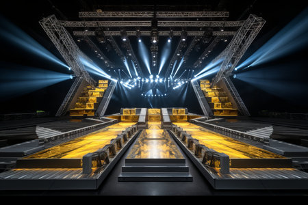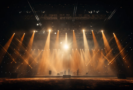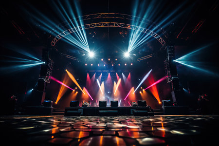 Generative ai on theme of beautiful illumination on a concert stage, bright lighting with spotlights