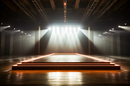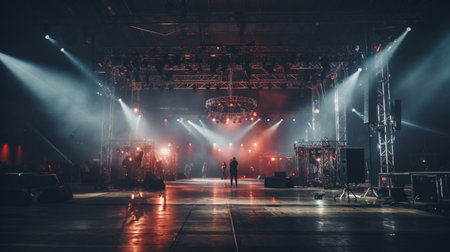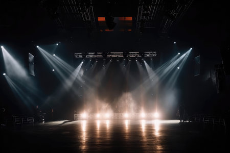 Empty concert stage with illuminated spotlights and smoke. Stage background with copy space AI generated