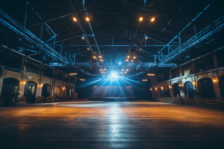 Dark modern concert music venue with an industrial atmosphere, ceiling lights shining onto the stage