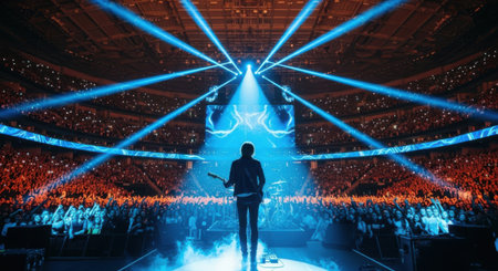 A solitary figure stands on a brightly lit stage, surrounded by a sea of spectators under dramatic blue spotlights.