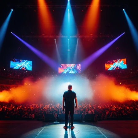 A lone figure stands on a brightly lit stage, bathed in colorful spotlights and surrounded by atmospheric fog, facing a large audience.