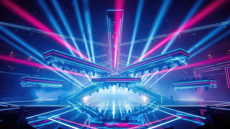 A stage with dynamic moving lights creating a high-energy atmosphere