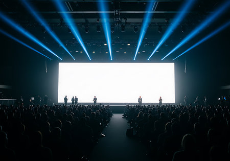 A large, bright screen dominates a stage, bathed in dramatic blue spotlights, with an audience silhouetted in the foreground.