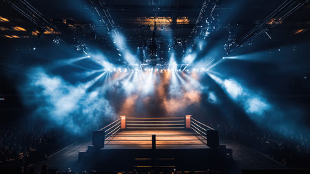 Spotlights shine on a boxing ring, highlighting the center stage where the night's match will take place.