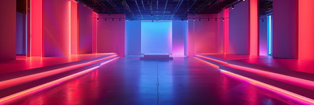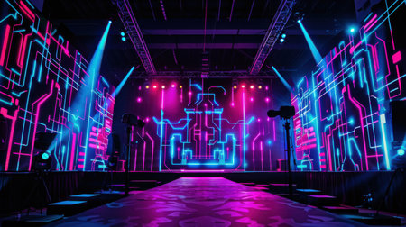 A stage is set up in a dark concert hall or event space with neon blue and pink lighting, a brightly lit walkway, and a backdrop of illuminated circuit boards.