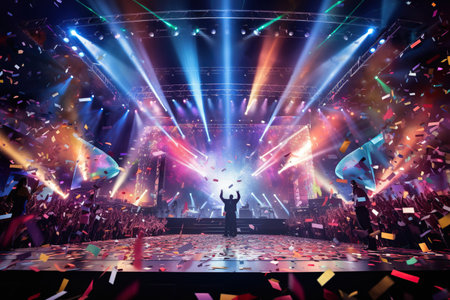 showing concert crowd cheering under a shower of gold confetti and dramatic stage lighting creating an energetic and celebratory atmosphere. resolution...