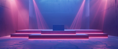 A three-tiered platform with neon lights illuminated in pink and blue, in a dark room.