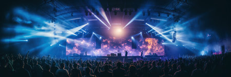 Stage lights and crowd of audience with hands raised at a music festival. Fans enjoying the party vibes.