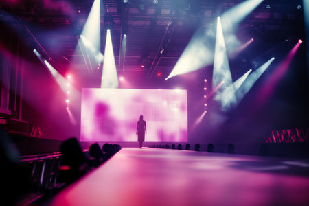 In a vibrant concert hall, a solitary silhouette stands before an elegant advertising banner mockup, illuminated by striking stage lights