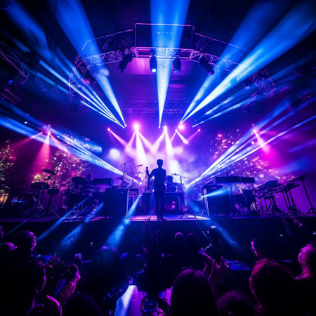A captivating display of colorful stage lighting in a dark venue creates an exciting atmosphere during a live concert performance, enhancing the visual experience for the audience.