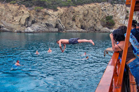 Neos Marmaras, Turtle Island, Greece, Jun 08, 2013. Tourist drive to Turtle Island near Neos Marmaras. Boats are anchored while tourists traditionally jump from the boat into the sea.