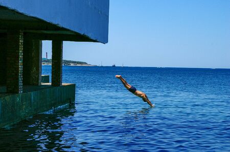 Man in a bathing suit dives into the sea from a wooden pier, wearing black rubber shoes