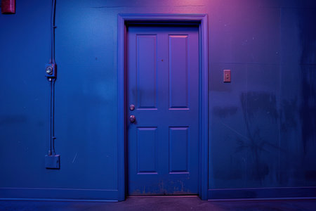 A vivid blue door set in a dark purple wall under evening lighting, invoking mystery