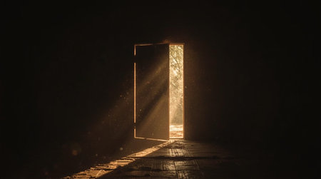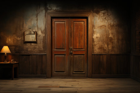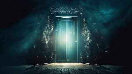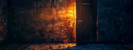 Mysterious door stands ajar in dimly lit room, casting warm glow that contrasts with dark, textured walls. light spills onto polished floor, creating inviting yet enigmatic atmosphere
