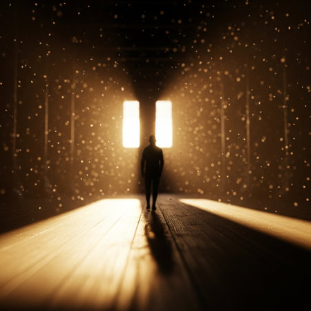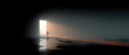 A solitary figure walks toward a bright light emanating from an open door in a dimly lit environment reflecting on wet surfaces.