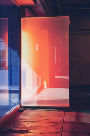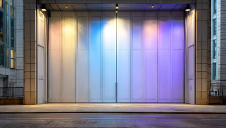 An architectural facade features a large, central opening illuminated by vibrant light projections. The building displays a contemporary design with a minimalist aesthetic, incorporating clean lines and a neutral color palette. The scene is bathed in a combination of warm and cool tones, suggesting potential uses in advertising or design projects.