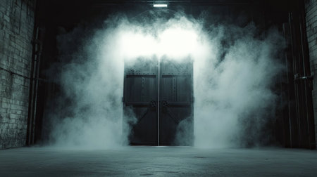 This immersive image features heavy doors partially opened, revealing a fog-filled dark space. The gentle light creates a mysterious and suspenseful atmosphere.