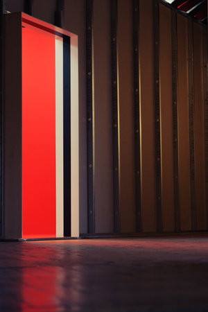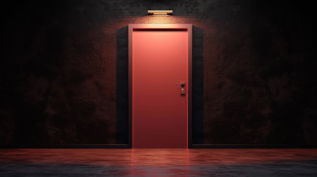 Vibrant red door stands prominently against dark, textured wall, illuminated by warm overhead light. scene evokes sense of mystery and anticipation, inviting exploration