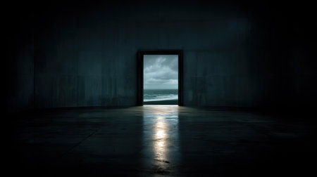 Dramatically lit, dark, and empty room with raw concrete walls and a highly reflective, wet floor. A single, central doorway frames a view of a turbulent ocean under a heavily clouded, gray sky, suggesting a transition or contrast between the confined interior and the expansive, wild exterior.