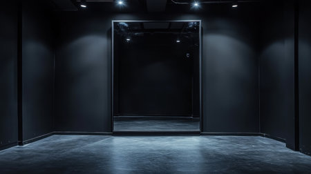 A minimalistic dark room featuring a large mirror and soft dim lighting, creating an atmosphere of solitude and simplicity, perfect for artistic concepts and reflections.