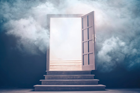 Open door emitting light possibilities growth achievements concept motivation learning skills knowledge heaven doors exit abstract simple background new ways entering leaving space imagination