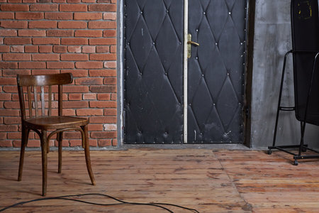 The interior of an old room with a brick wall. A chair in the middle of the room.