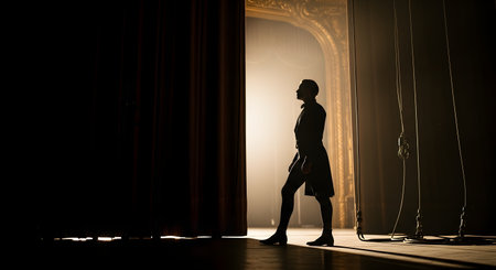 A dramatic silhouette of a man in a vintage tuxedo stepping onto a dimly lit stage from behind a heavy curtain. A bright spotlight illuminates him from behind, creating a sense of anticipation and performance.