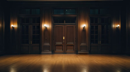 A beautifully designed entryway featuring rich wooden doors and soft lighting, creating a warm ambiance. Ideal for interior design projects or elegant home settings.