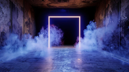 A captivating scene featuring a neon-lit portal framed by mist in an abandoned industrial setting, creating a surreal and atmospheric visual experience.