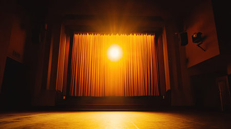 A stunning view of a theater stage illuminated by warm light filtering through golden curtains, creating a captivating atmosphere perfect for performances and events.
