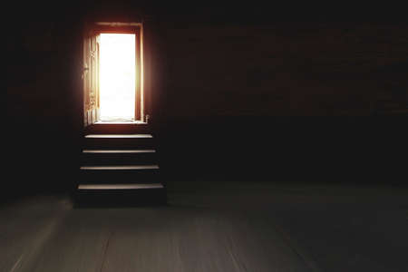 Light shines from door opening in dark room. Brown wooden door to the universe. Fills the space with bright warm light. Room with wooden textured floor. Entrance or exit, way out concept. 3D render