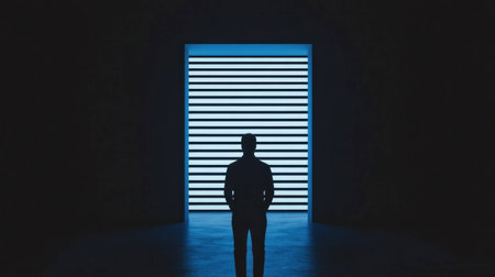 A silhouette of a man standing in front of a bright blue striped door, evoking a sense of mystery and introspection in a dark environment