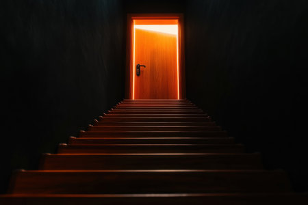 A mysterious staircase leading to a softly lit door, evoking curiosity and anticipation in a dark setting.