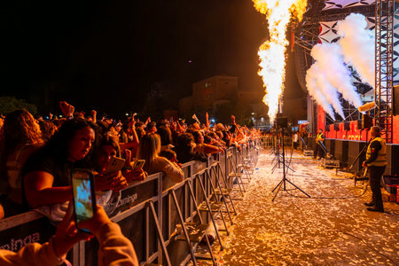 Rock concert, silhouettes of many people enjoying rock concert, music festival