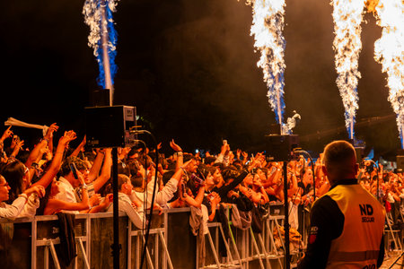 BONTIDA, ROMANIA - JULY 14, 2017: Crowd of people partying during a NERO concert at Electric Castle festival. Confetii cannons throwing confetti on crowd