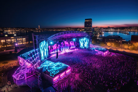 Stunning sunset view of an outdoor music stage adorned with colorful lights. This vibrant urban scene showcases a picturesque skyline at dusk.