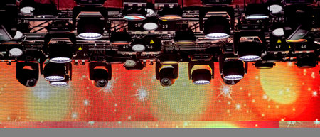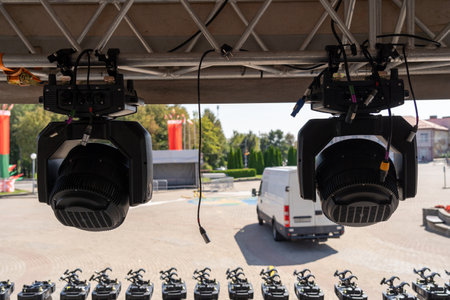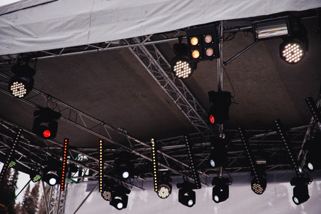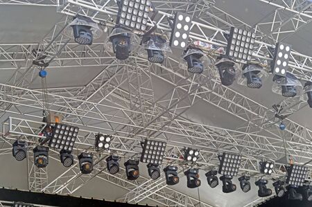 Close-up of lighting equipment for stage concert, searchlight, lamp.