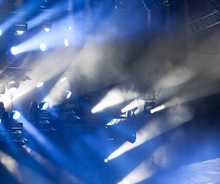 Light effects on stage created with theatrical lighting equipment and a smoke machine