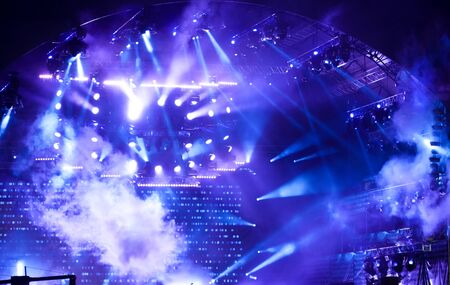 Stage lights on concert. Lighting equipment with multicolored beams.