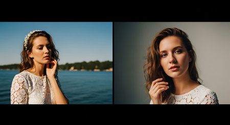 A young woman in a white lace dress poses in two different settings: outdoors by a serene body of water and in a studio with a neutral background.