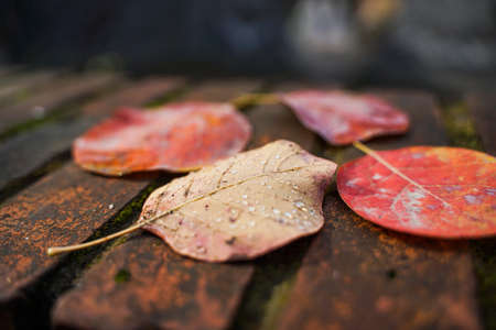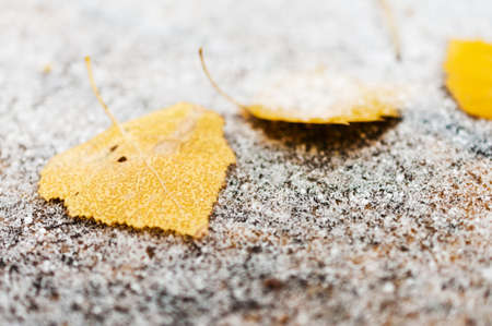 Yellow fallen leaves on the wooden table, covered with fine snow. Abstract background.