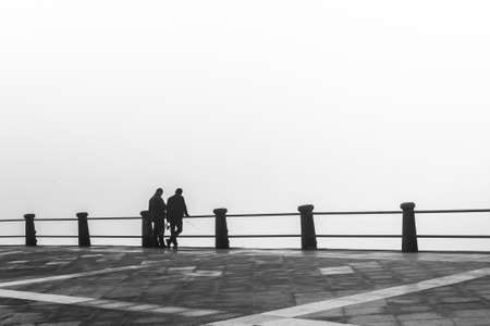 Two chinese fishermen at the coastline discussing on a foggy day black and white