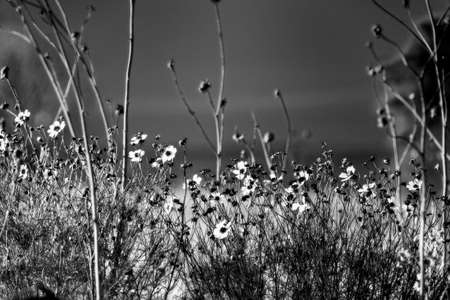 Monochrome image of narrow-leaf Texas sunflowers illuminated by early morning sunshine