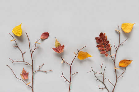Creative autumn concept. Branches of trees with colorful autumn leaves on clothespins on gray background. Top view, Flat lay.