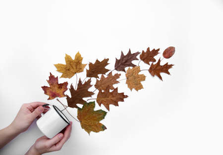 Colorful autumn leaves arranged on a white background creating a beautiful display of fall colors, showcasing the transition of seasons from summer to winter