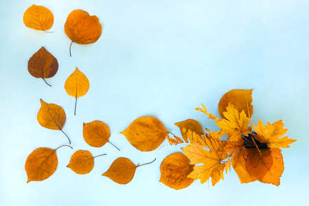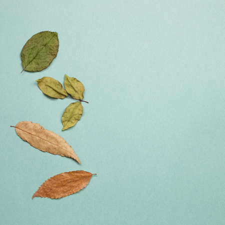 Creative Christmas winter autumn fall day composition with decorative dried leaves. Flat lay, top view, copy space, still life blue pastel background for greeting card