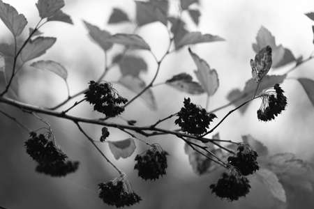 Maple tree in frosty winter day. Autumn harvest of maple covered with snow. Cold, early frosts, hoar concept